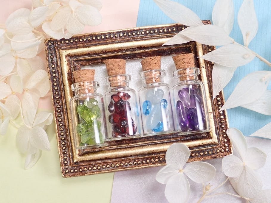 小瓶 4点セット(ペリドット・ガーネット・アクアマリン・ブルートパーズ・アメシストなどトランプカラーのルースやさざれ石)