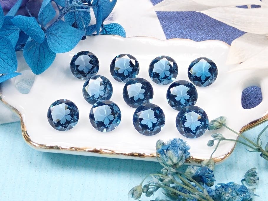 12mmのロンドンブルートパーズにさくらインカットを施した、こちらも通常シミズ貴石様では取り扱っていないオリジナルサイズです。
