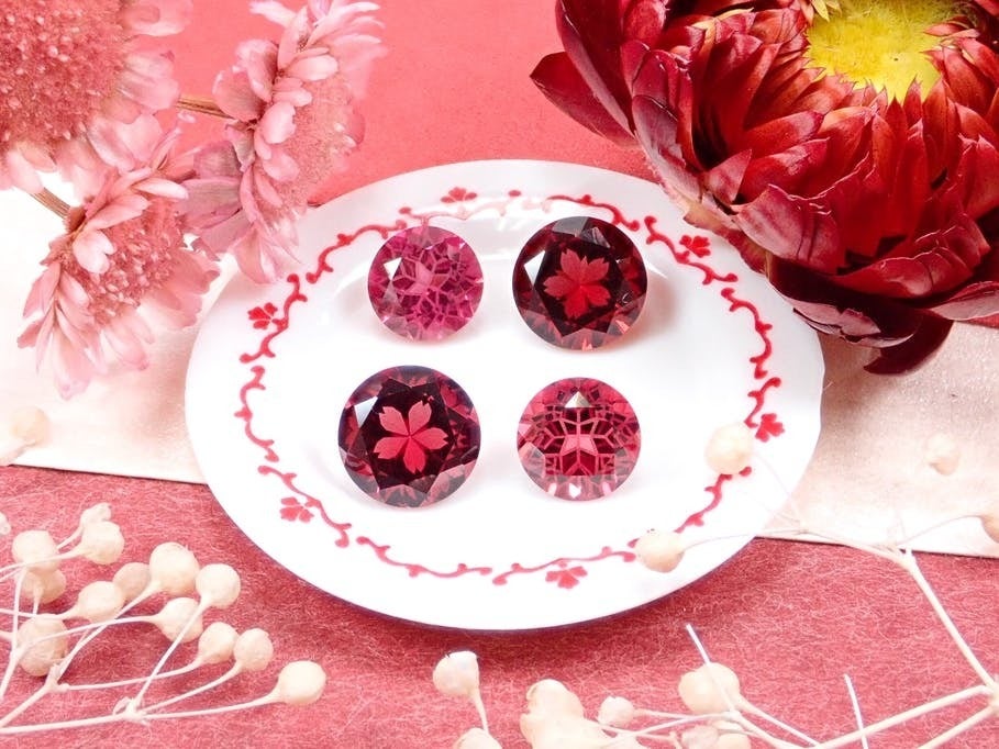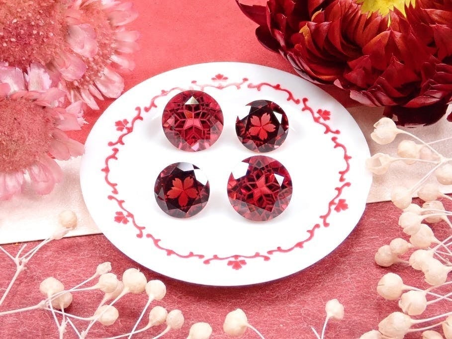 アルマンディンガーネットのさくらインカットとダンデライオンカットの2石セット。どちらも情熱的なレッドカラーに美しいカットがよく映えます。こちらは、さくらインカットの方が1mm大きいセットです。