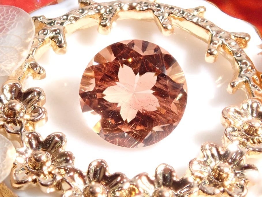 世界一美しいラブラドライトといわれるオレゴンサンストーンは、コレクターを中心に近年人気が上昇し続けている宝石です。そんなオレゴンサンストーンの美しさをさらに引き立てるシミズ貴石様のさくらインカット。9mmと大粒のさくらインカットは圧巻の存在感があります。