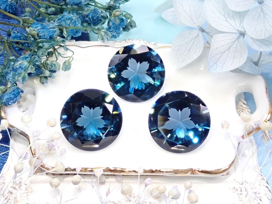 12mmのロンドンブルートパーズのダンデライオンカットも、今回特別に作っていただいた、通常シミズ貴石様で取り扱っていないオリジナルサイズです。