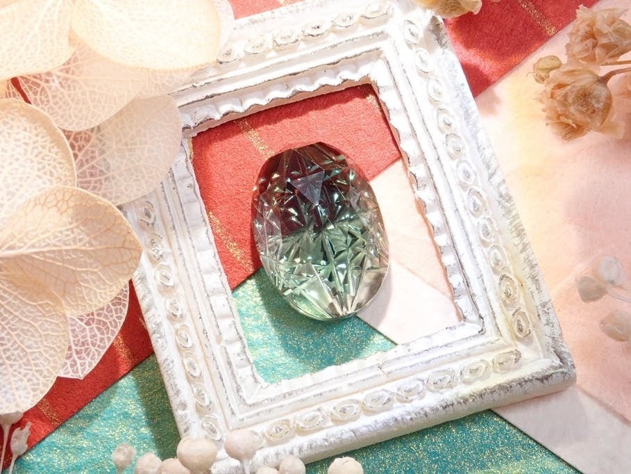 切子面を深澤陽一氏が、ファセット面をシミズ貴石 清水幸雄氏が施す世界初のカッティング法です。