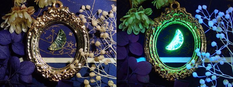 ブラックライトで蛍光する性質をもつハイアライトオパール。幻想的でどこか妖艶さすら感じさせる美しさは、見る人を幻想の世界へと誘います。
