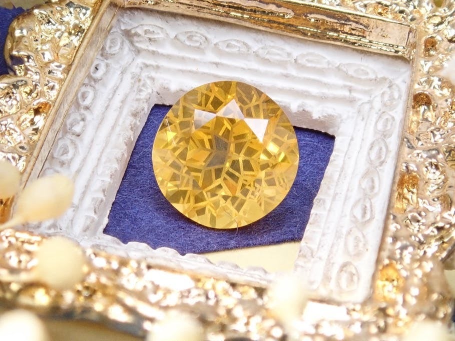 宝石トランプ+【ダンデライオンカット】イエローサファイア7.1mm+ シミズ貴石 清水幸雄氏+カラッツオリジナルアルバム +日独宝石研究所【さくらインカットオリジナル鑑別書】