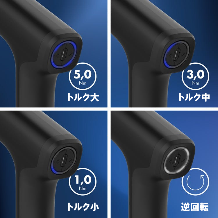 また順回転モードの時はLEDが青色に点灯、逆回転モードの時はLEDが白色に点灯するため、どちらの回転モードとなっているかが一目で分かりとても便利です。