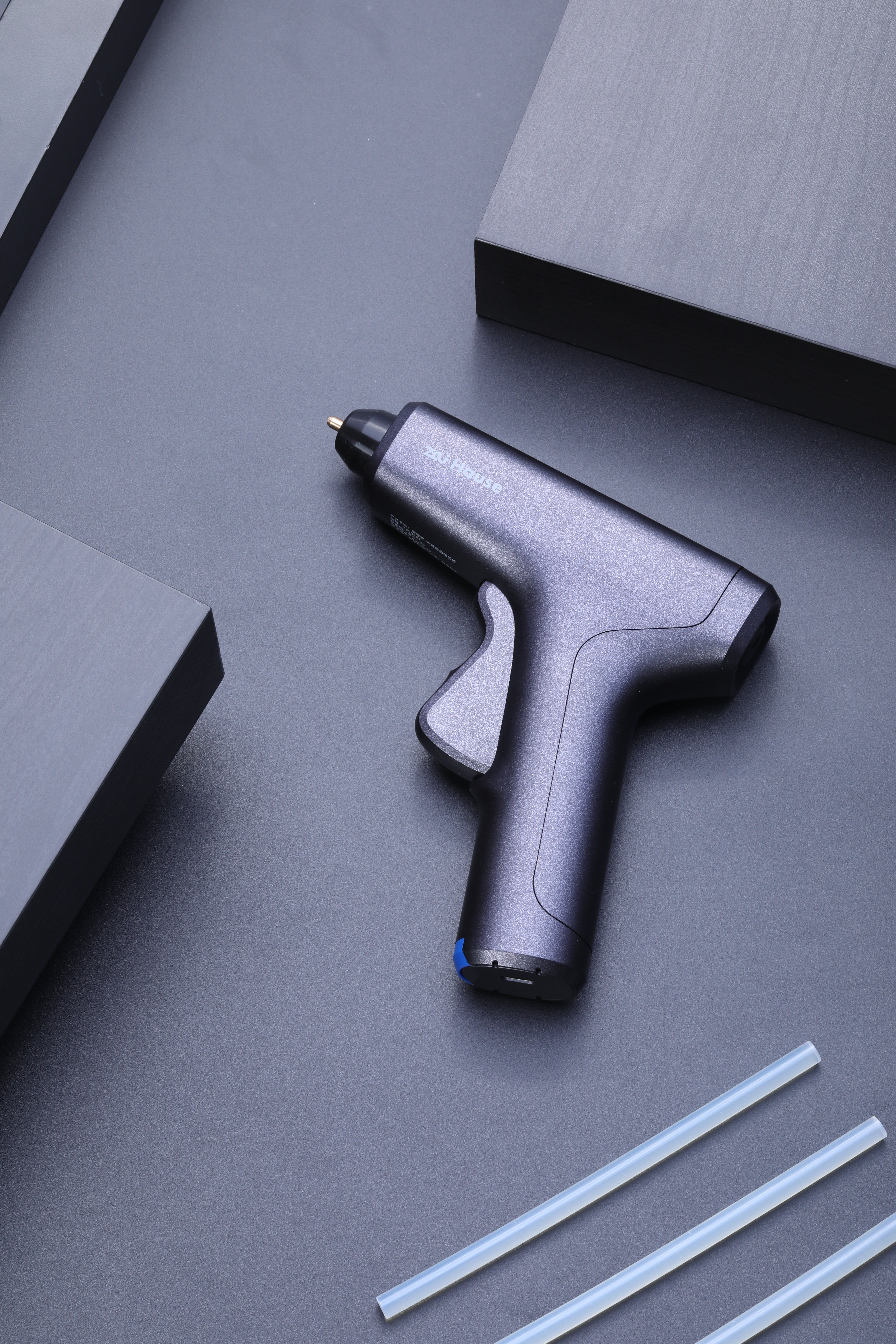 「Zai Hause DIY-KIT PRO 」の電動グルーガンは、本体底部の青色パーツをスライドさせるだけで自立可能なので、作業の途中にその辺に立てて置いておけてとても便利です。