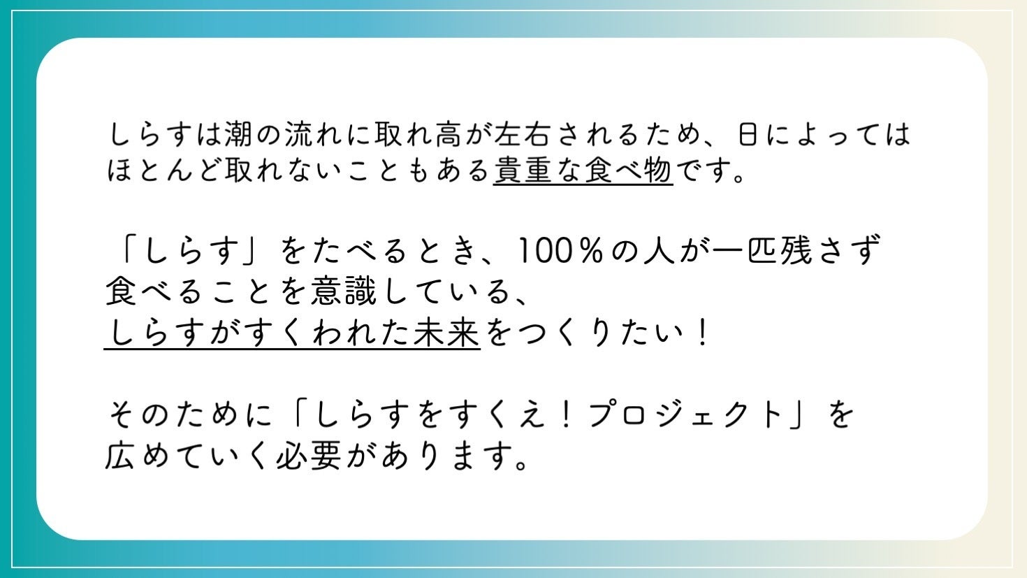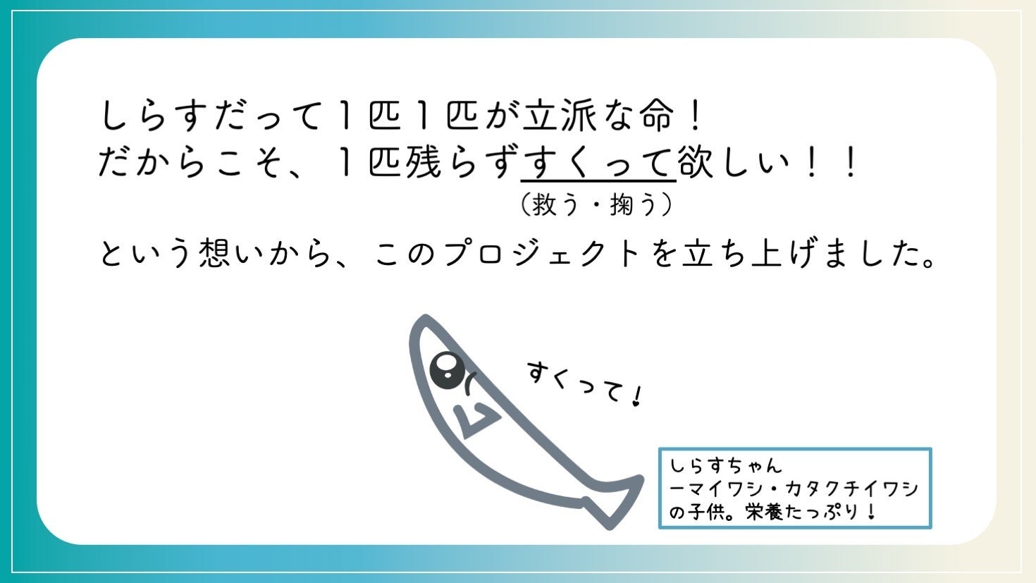 しらす1匹1匹だって立派な命なのだから、最後の1匹まで感謝していただくべきだと思っていた私にとって、それは衝撃的かつショックでした。でも実際、私は小さい頃よく親や学校の先生に「お米は一粒残さず食べましょう」と言われてきましたが、しらすは1匹残さず食べましょうと教わったことは一度もありません。そんなのおかしいじゃないか!しらす残しちゃダメだよ!と思ったことがこのプロジェクトを立ち上げようと思ったきっかけです。