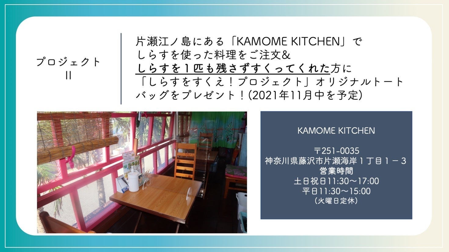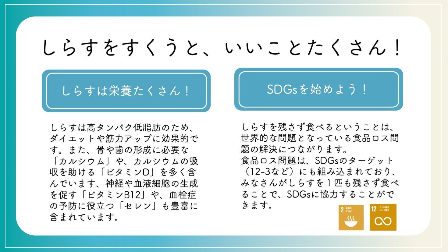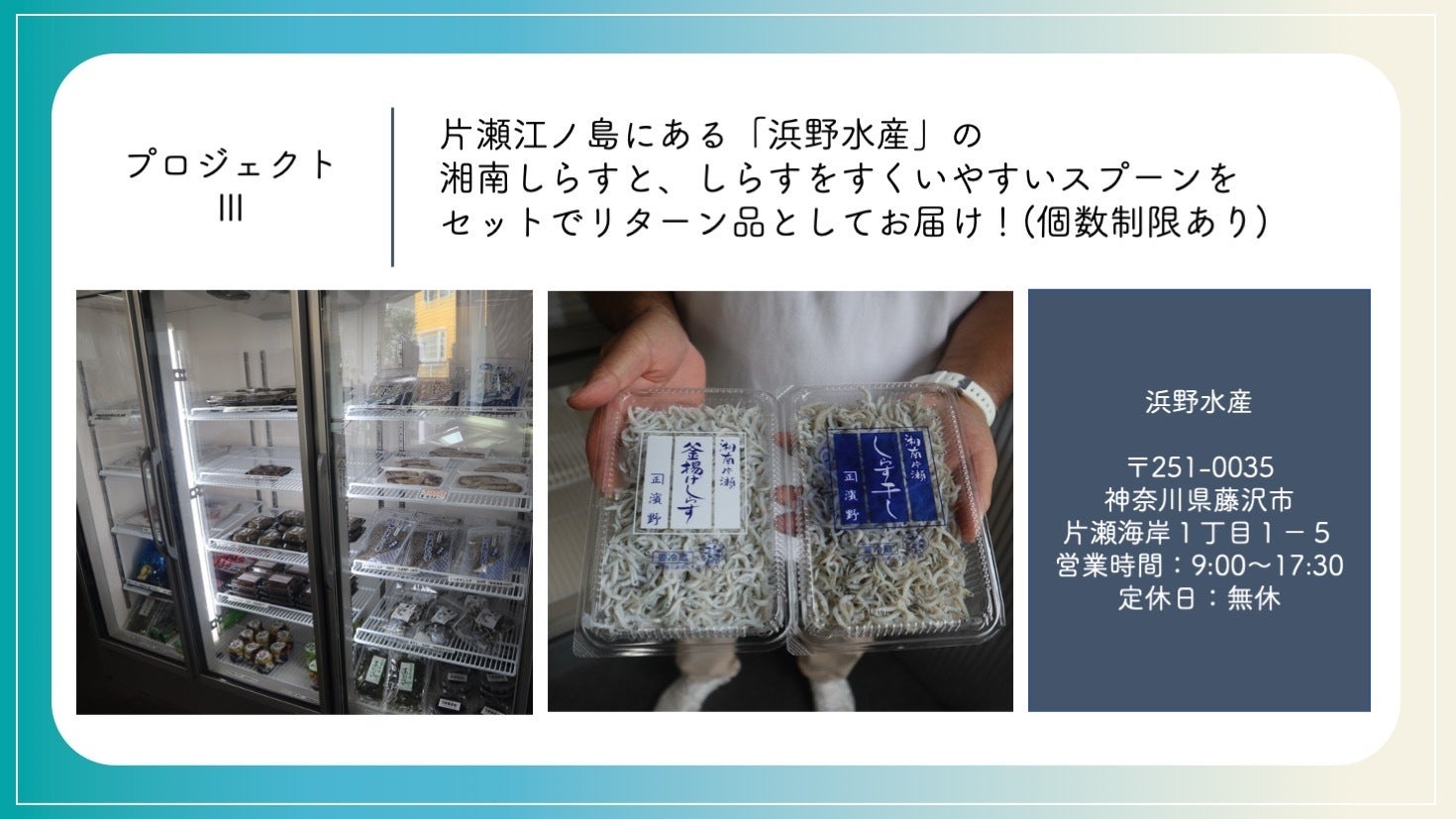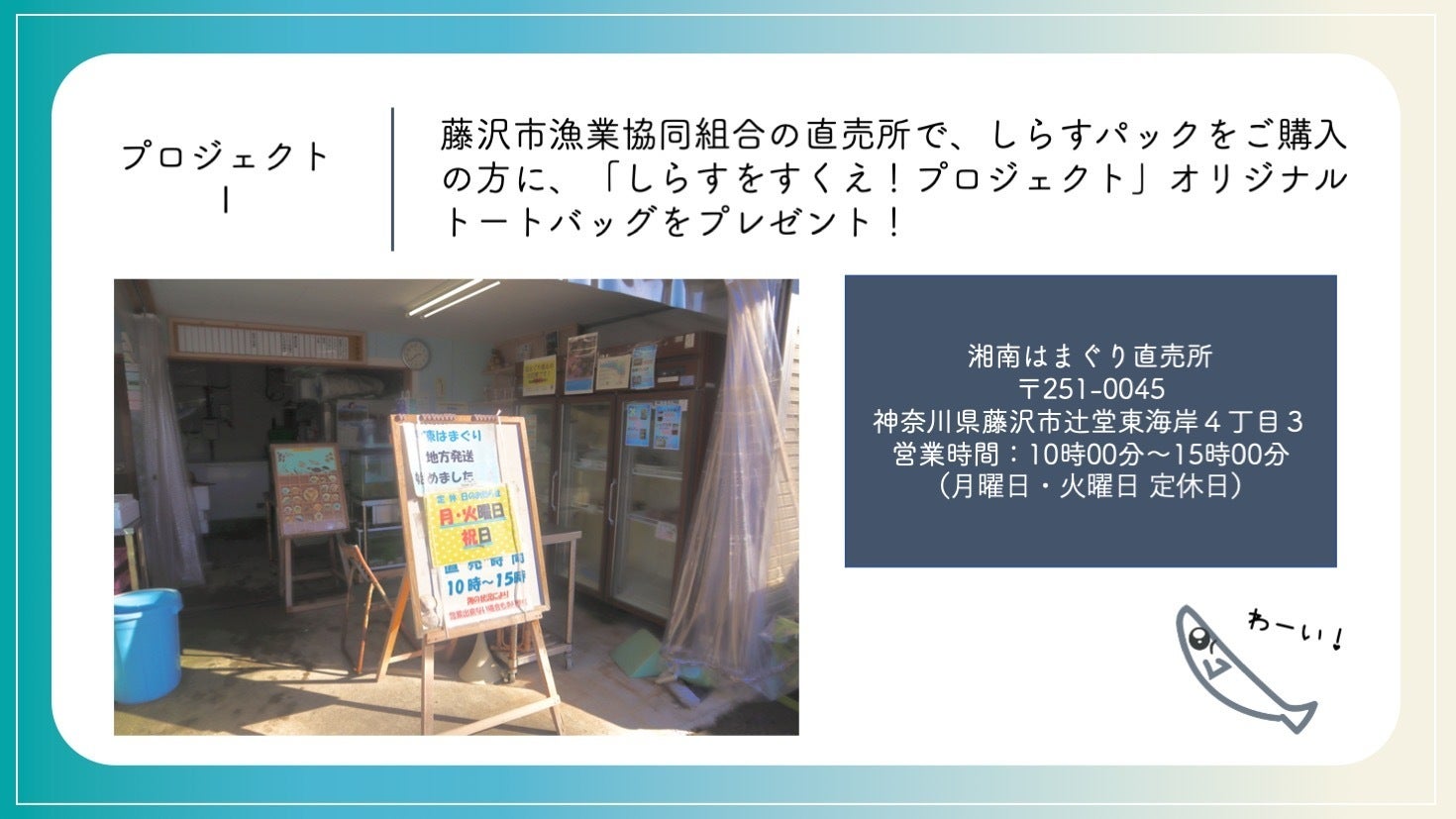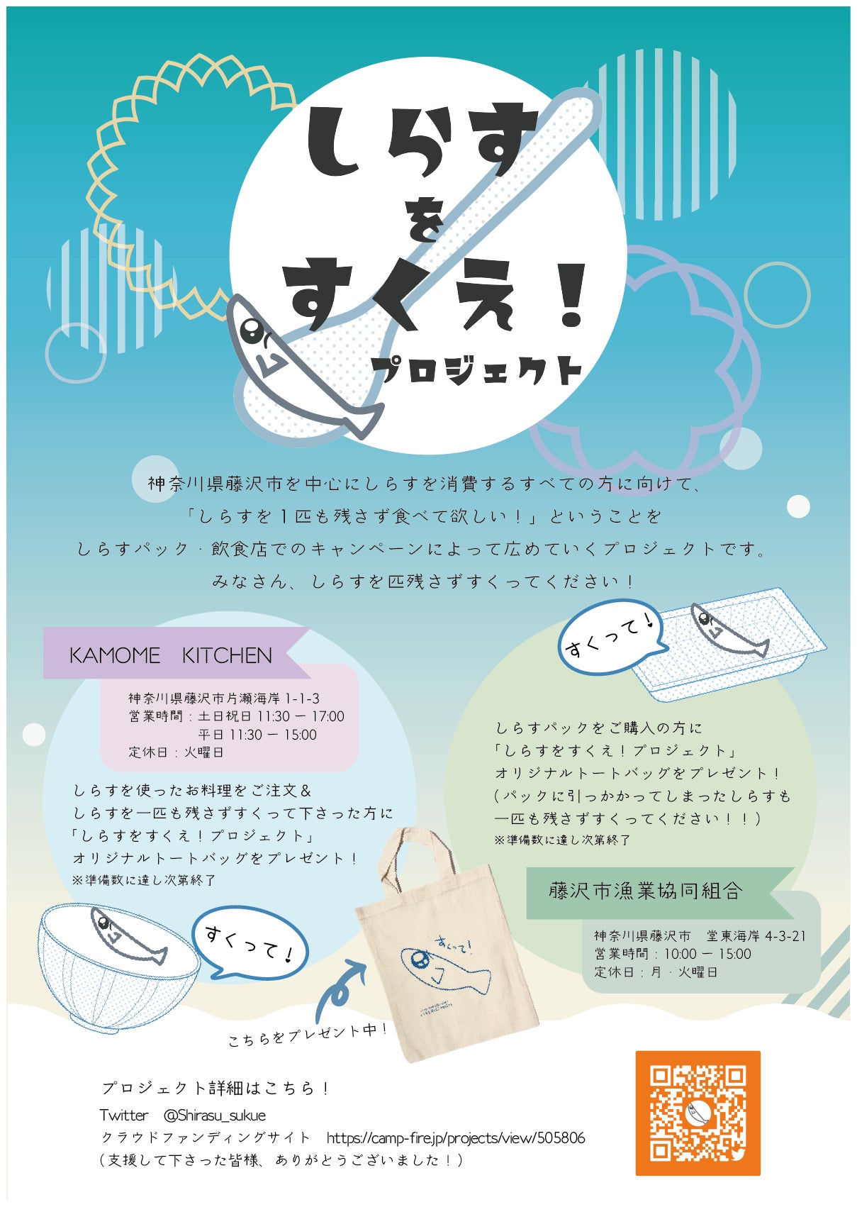 神奈川県藤沢市を中心にしらすを消費するすべての方に向けて、「しらすを1匹も残さず食べて欲しい!」 ということをしらすパック・飲食店でのキャンペーンによって広めていくプロジェクトです。 みなさん、しらすを1匹残さずすくってください!