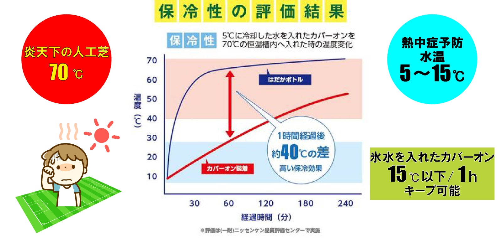 第三者機関の「ニッセンケン品質評価センター」に評価を依頼した結果、「COVER-ON」をしたボトルとカバーをかけない「はだかボトル」の差は歴然でした。 1時間程度で約40℃の差が出ることがわかりました。