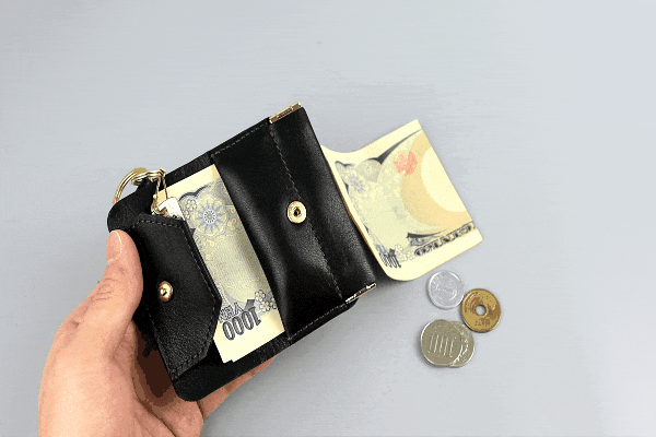 また一般的なミニ財布はサイズや薄さを優先するあまり、小銭入れが使いづらくなっていることが多いですが、バネ口の小銭入れの場合、片手で開くことができ、一瞬で小銭を見渡すことができるので、抜群の使い心地を実現しています。