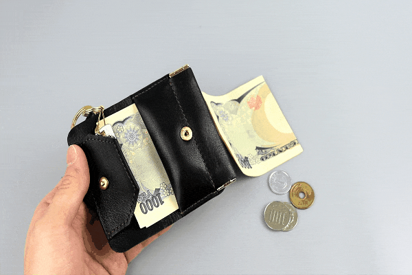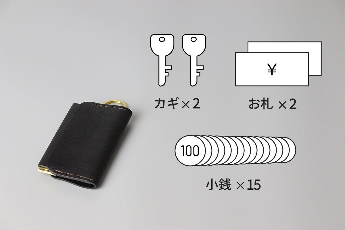 コンパクトサイズながら、鍵2本、小銭15枚(999円)、お札2枚を収納することが可能です。
