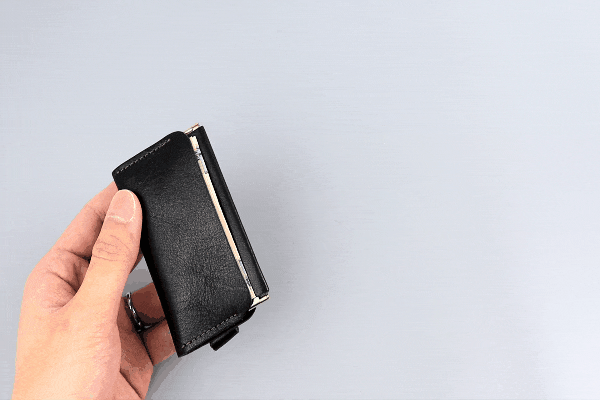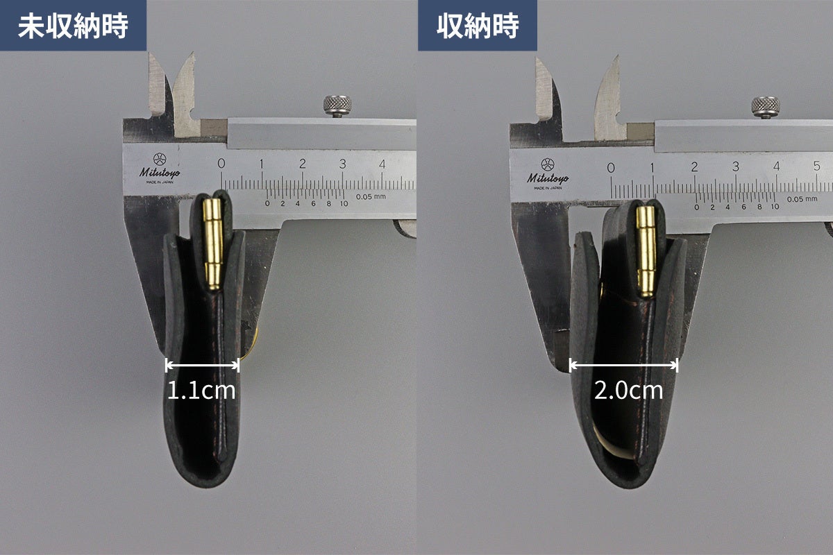 厚みも未収納時は1.1cm、小銭15枚、お札2枚を収納しても約2.0cmと薄型です。