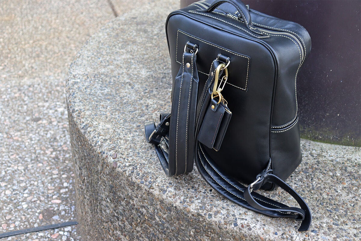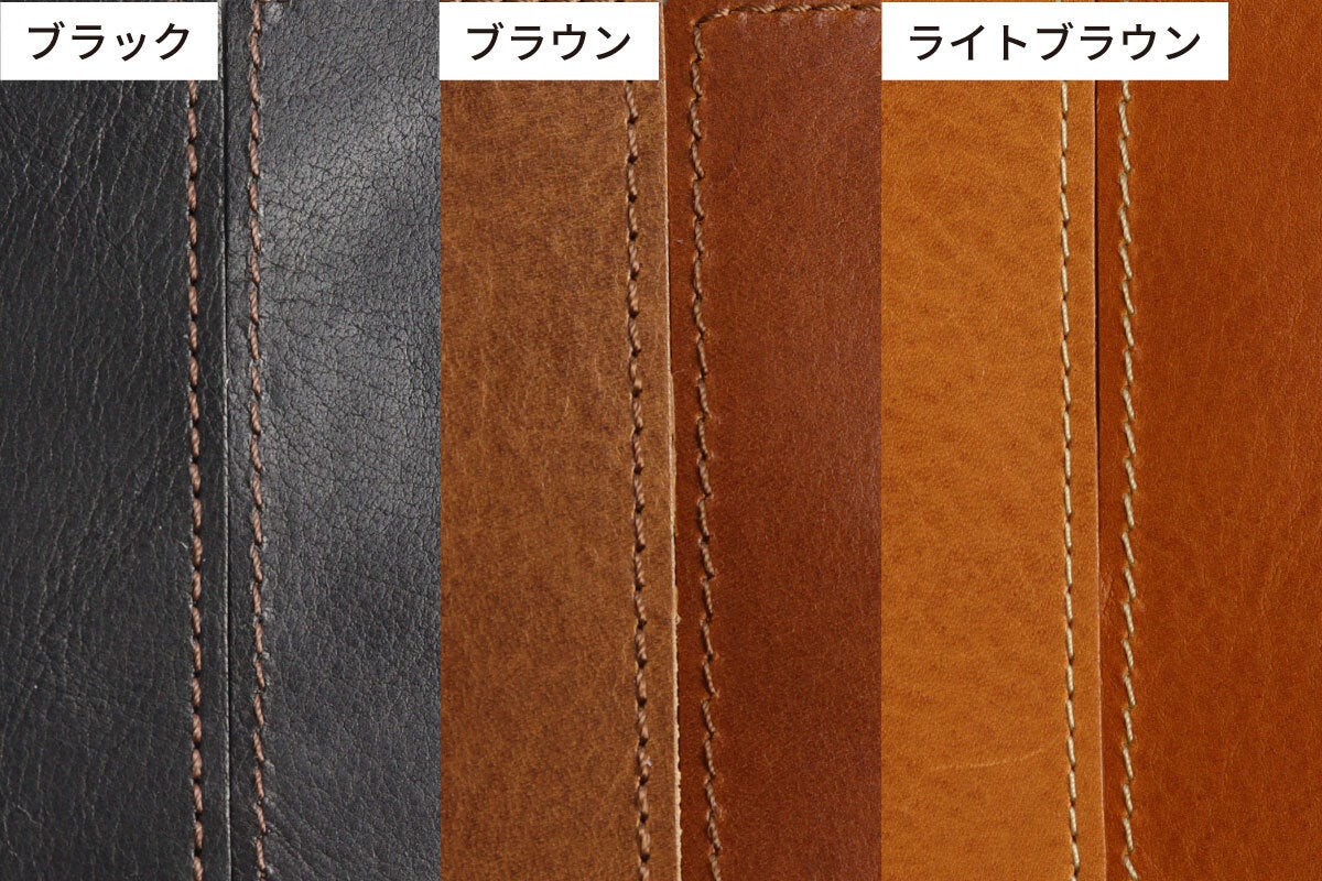 革の重厚な雰囲気やカラーに合わせて、黒にはビンテージのレザージャケットなどでよく見るこげ茶のステッチ、ブラウンは同色のステッチ、ライトブラウンは生成系のステッチで仕上げました。