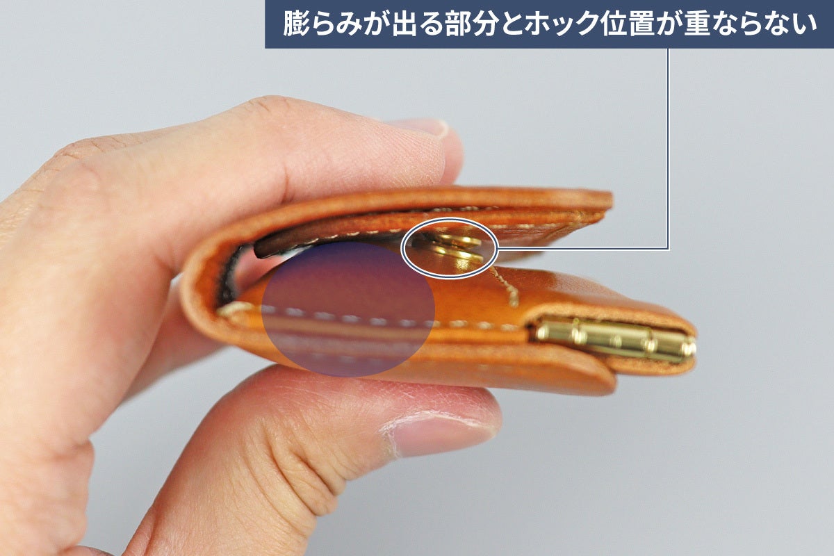 バネ口の小銭入れは小銭を入れた際に厚みが出やすいですが、「ワンマイルウォレット」は小銭入れの一番膨らみがでる部分とホック位置が重ならないように設計しているため、小銭を収納しても厚さ2.0cm以内に収めることができました。