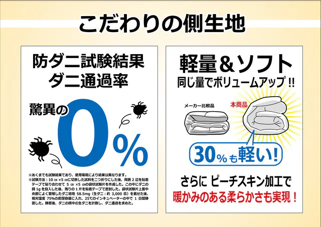 また高密度に織り上げることにより不快なダニの侵入も許さず安心&清潔にお使いいただけます。