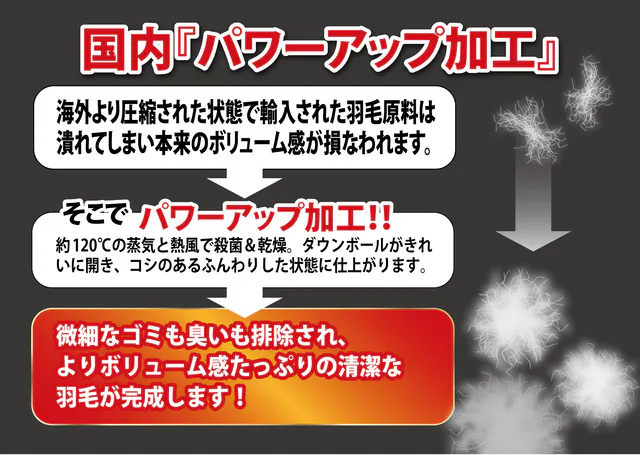 徹底洗浄した原料をさらに「パワーアップ加工」という、120℃の蒸気と熱風を羽毛に吹き付け除菌し、風を当て乾燥させることにより、ダウンボールがきれいに開きふわふわフカフカな羽毛布団になります。