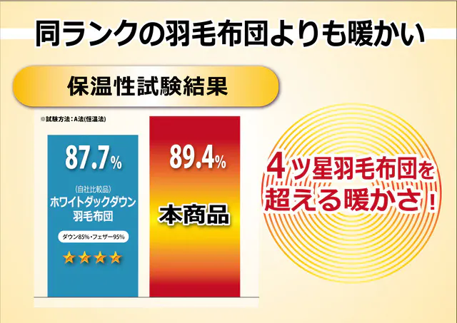 なんと今回開発した次世代羽毛布団は、日本羽毛製品協同組合が発行する4つ星エクセルゴールドラベルクラスの新毛の高級羽毛布団を超える暖かさも実現しました。