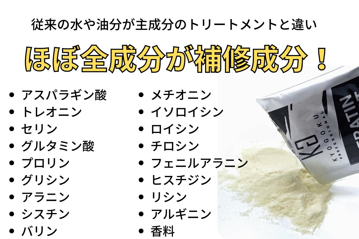 一般的に使用されているケラチンは、羊毛が原料となっているケラチンが多い中、「KYOGOKUケラチンブースト+」は人毛由来のケラチンを配合しています。