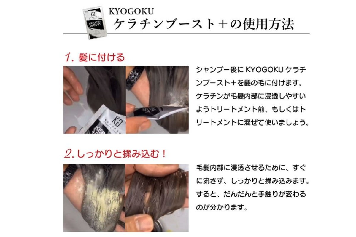 髪の毛をケアするには、髪の毛と同じケラチンを多く含むKYOGOKUケラチンブースト+が非常に優秀です。