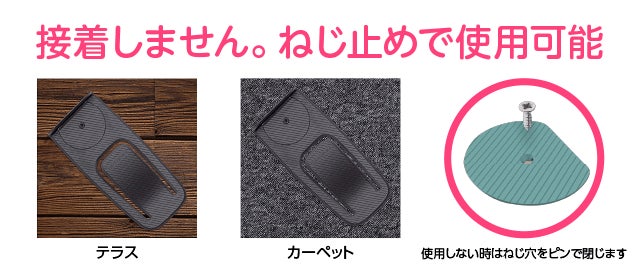 A:凹凸のある床(テラス等)やカーペットには接着いたしません。ご希望の場合は同封しておりますオプションのネジをご利用下さい。