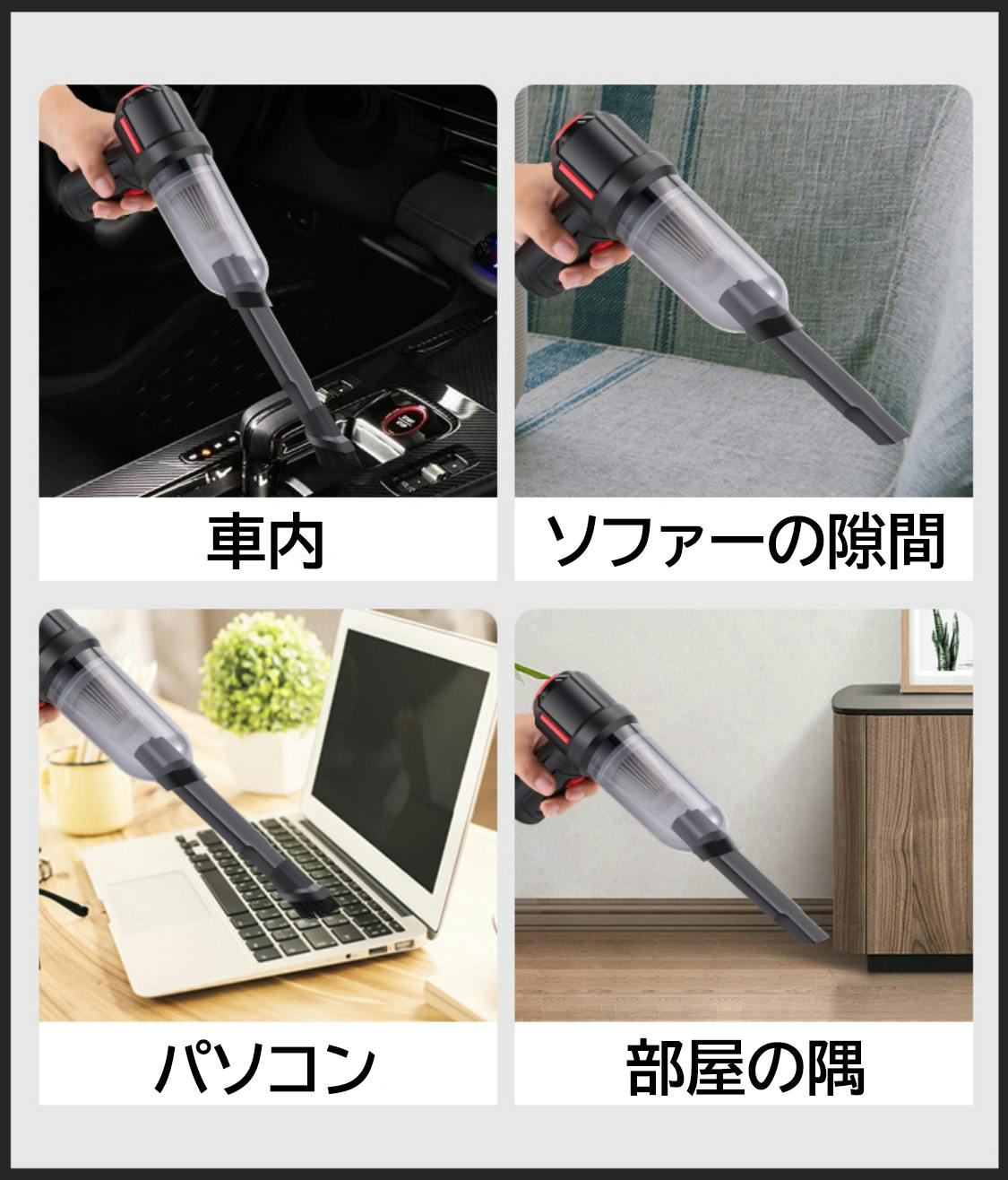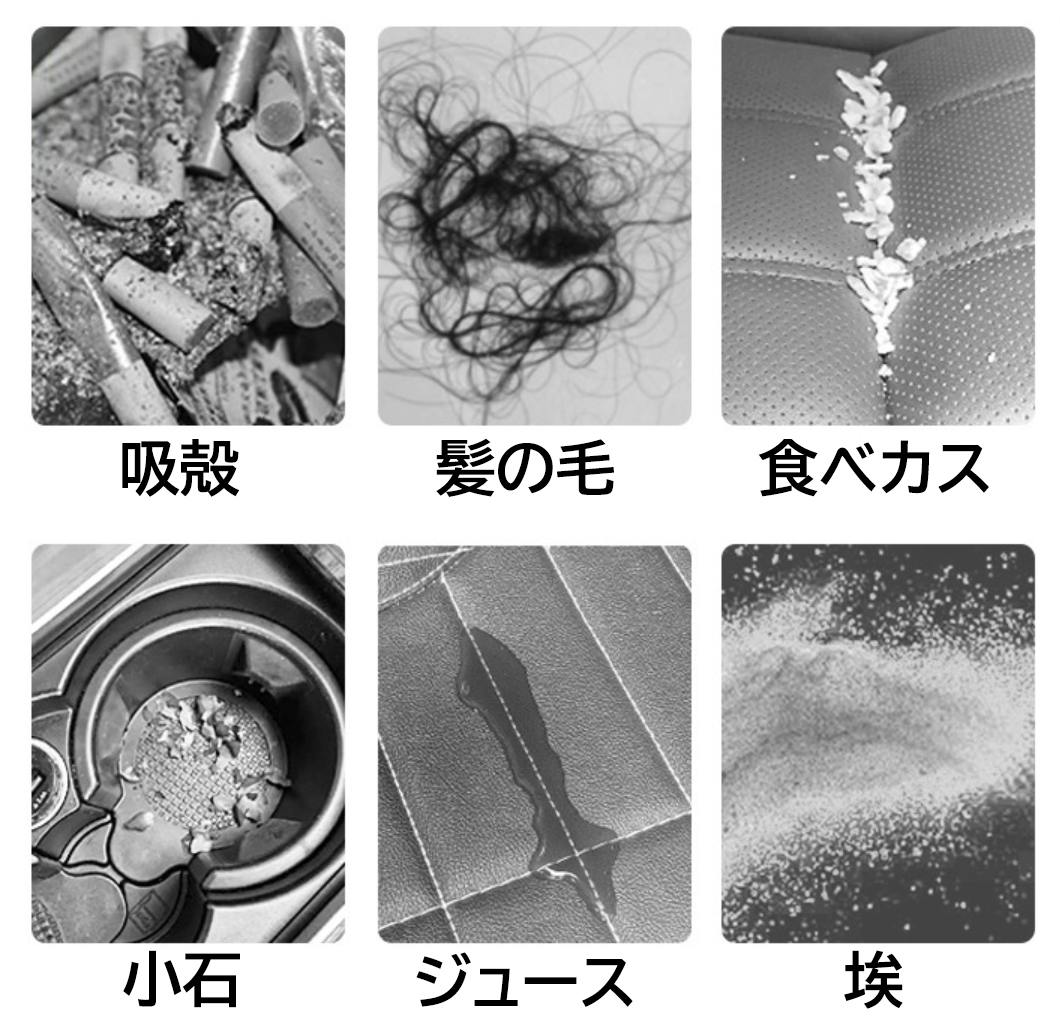 車内に残った食べカス、ほこり、粉末、小石、紙くず、髪の毛などをキレイに掃除できるのはもちろんのこと、家の床に残ったペットの毛、化粧パウダー、食べ残しなどもしっかりと吸い込むことができます。