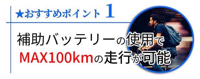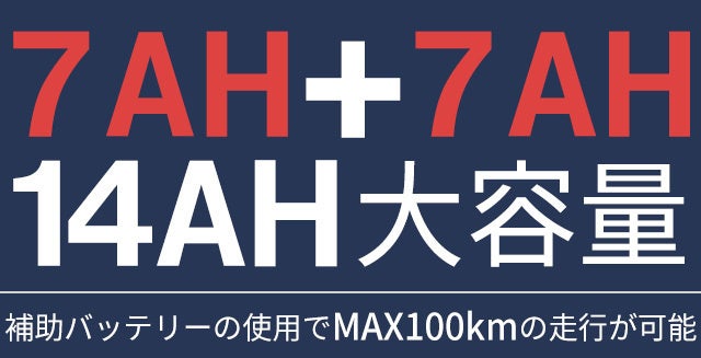 補助バッテリーの使用で、本体バッテリー7Ah50km+補助バッテリー7Ah50kmの計100km走れます!
