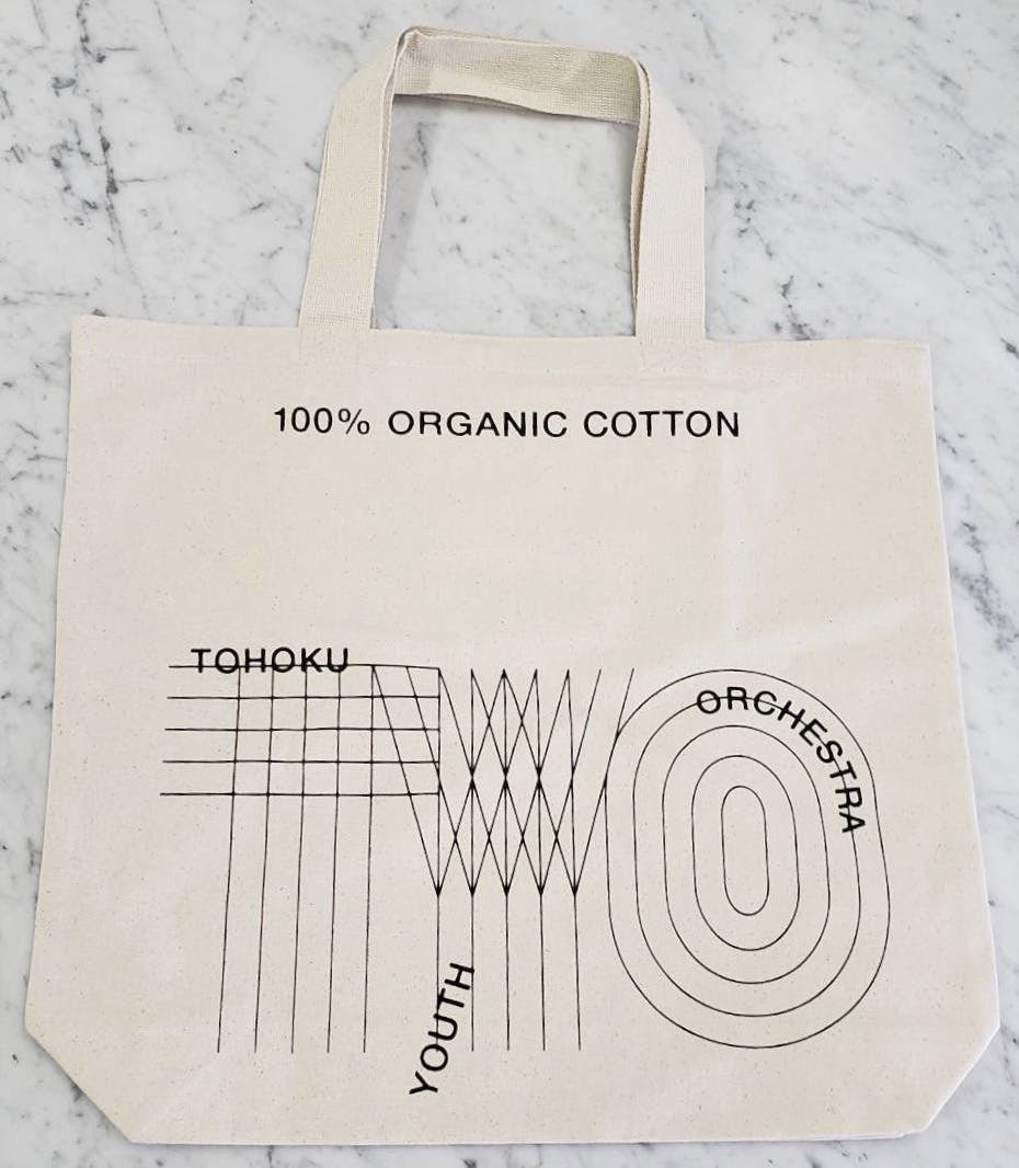 コロナの影響で中止になってしまった演奏会2020の記念品として坂本龍一監督より団員全員へプレゼントされたものです。団員以外は持っていないプレミア物です。グラフィックデザイナーの長嶋りかこさんが手懸けたTYOのロゴがおしゃれにプリントされています。A4サイズで普段使いもしやすいので、団員おすすめのバッグです。