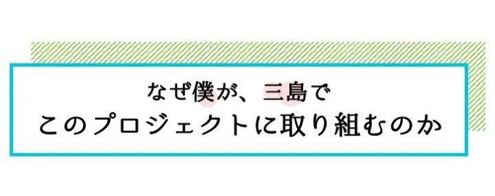 会社員をしながら起業して地域で事業を起こすことになるなんて、僕自身、想像もしていませんでした。自分の可能性を広げてくれたのは、三島という地域のオープンな土地柄、人柄のおかげです。東京から偶然のご縁で出会った三島で、今度は僕が、訪れる人にそんな「偶然の出会い」から「可能性が広がる」きっかけを提供していきたいです。