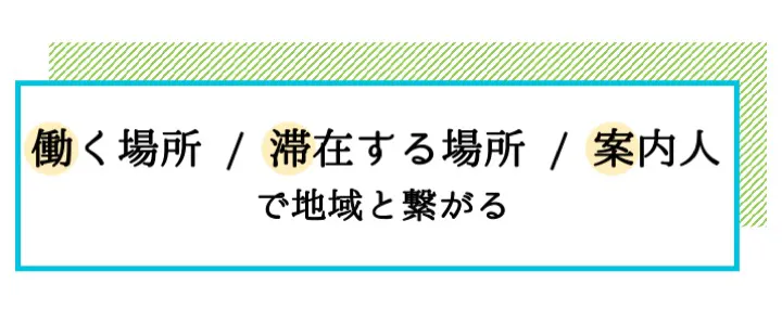 この3つの場を組み合わせることで、「移住未満の地域滞在」の選択肢を増やし、段階的に「様々な濃度で地域と関わる」ことを可能にします。