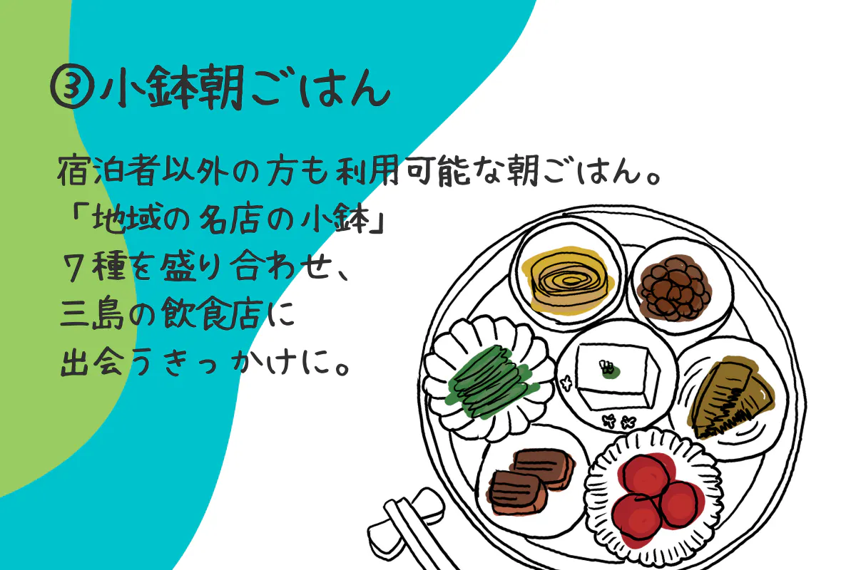 08:00、朝ごはんで地域の名店の味をつまみぐいしたら、徒歩2分のコワーキングスペース「三島クロケット」で09:00から仕事を開始。