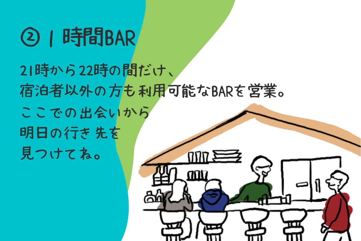 21時にはゲストハウスに戻りBARへ立ち寄り一杯。他の宿泊者や地域の人と会話をして、次の日のランチ候補がたくさん増える。