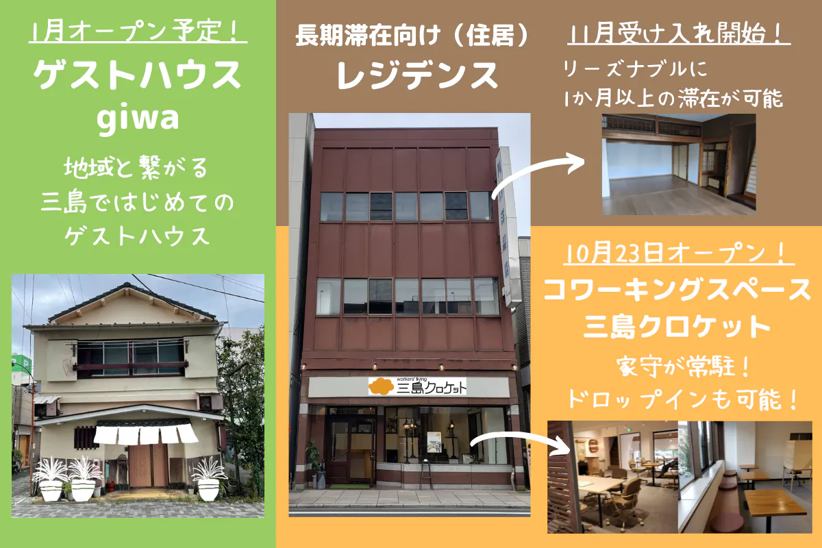 まずは数日間の滞在でも、訪れる人が「三島にもっと深く関わりたい」と思うきっかけになれば、「長期滞在」や「移住」に繋がるかもしれません。「移住」だけを最初からゴールにするのではなく、「結果的に」三島市の関係人口や移住者が増えて地域が賑わえばとても嬉しいです。