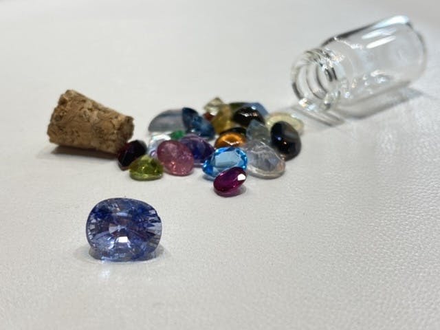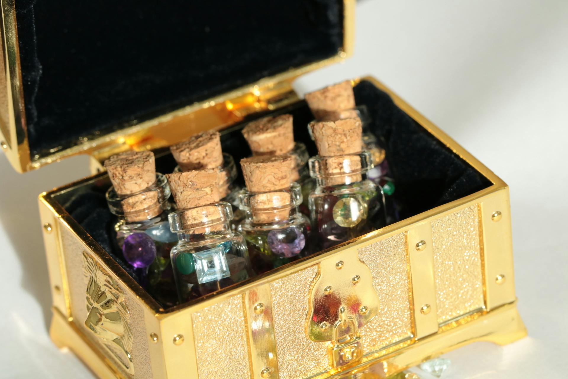 瓶の内容:エメラルド・ルビー・サファイア・アイオライト・アクアマリン・ブルートパーズ・トルマリン・ガーネット・アメジスト・シトリン・ペリドット・オパール・クオーツ・翡翠(ヒスイ)などその他たくさんの種類が入っています。