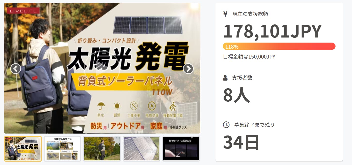 2022/05/27 19:14こんにちは!今回のプロジェクトの主催者、パーフェクトトレード株式会社代表の巫(かんなぎ)です。先日、5月20日よりプロジェクトを公開し一日目で目標金額に達成し、現在18万円弱を達成することができました!「気軽に脱炭素社会の実現に取り組むきっかけづくりのお手伝いをしたい!」という目標の元開発した「リュック型ソーラーパネル」を多くの方に届ける事ができ光栄です。ご支援いただいた皆さまに感謝し、スタッフと共に更なる目標達成に向け頑張っていきたいと思います!プロジェクト終了まであと残り34日ですが、引き続き弊社の『リュック型ソーラーパネル』を宜しくお願いいたします。 もっと見る