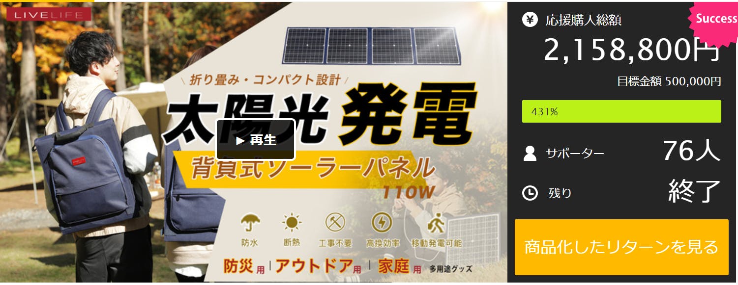 2022/05/29 21:30こんにちは!「リュック型ソーラーパネル」プロジェクトの主催者、パーフェクトレード株式会社代表のかんなぎです!「気軽にSDG’sや環境問題に取り組めるようお手伝いしたい!」と目標を掲げ開発したのがこちらのリュック型ソーラーパネルです。Campfireでのクラウドファンディングに先駆けて行われたMakuakeでは公開からわずか1日で目標金額である500,0000円を達成しました。約2ヶ月に及ぶプロジェクトでご支援頂いた応援総額は目標金額に対して、なんと430%超の2,158,800円!サポーター様は76人という大変沢山の方々にご支援をいただき、大盛況のなかプロジェクト終了を迎えました。応援購入だけでなく、大変ありがたいお声や応援コメントも沢山頂き、スタッフ一同励みにさせていただいております。1人でも多くの方にリュック型ソーラーパネルを手に取っていただけるよう、精一杯頑張りたいと思います!これからのアウトドアシーズンで大活躍間違いなしのリュック型ソーラーパネルのPT-110を今後とも宜しくお願いいたします! もっと見る
