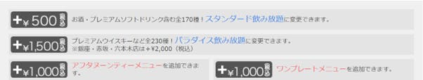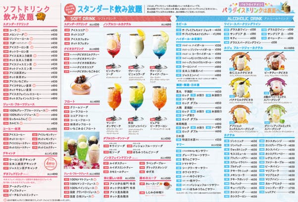 ・飲み放題メニュー/ソフトドリンク(無料)、スタンダード170種(+500円)