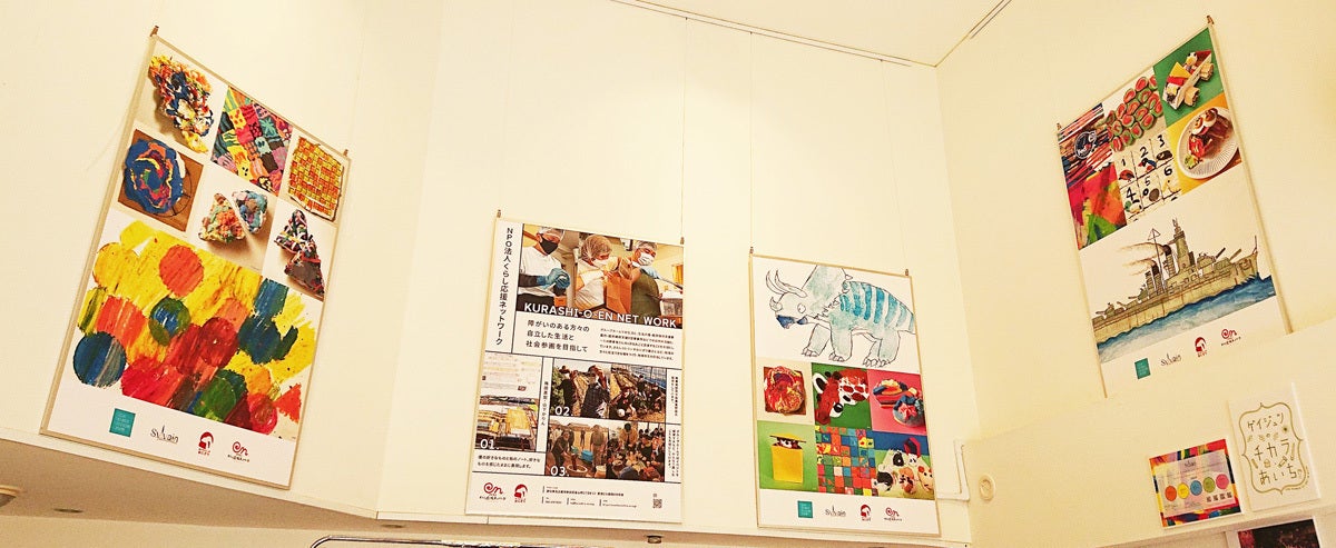 「めっちゃメッタおにぎり」の上部の壁には、アートが飾られています。「CODOMODUS sylvain」 さんに所属する、障がいを持った子供たちが描いた絵をパネルにして展示しているのです。私たちNPO法人くらし応援ネットワークは、障がい者アートの活動に賛同しており、「めっちゃメッタおにぎり」の上部壁面をアートの展示スペースとしてお借りして、同じように名古屋市で障がいを持った子どものアート活動を支援している「CODOMODUS sylvain」 さんに、アートをお借りしたのです。「めっちゃメッタおにぎり」にいらっしゃるお客様に、このアートがとても好評です。ポップでカラフルなアートは店内をとても明るい雰囲気にします。