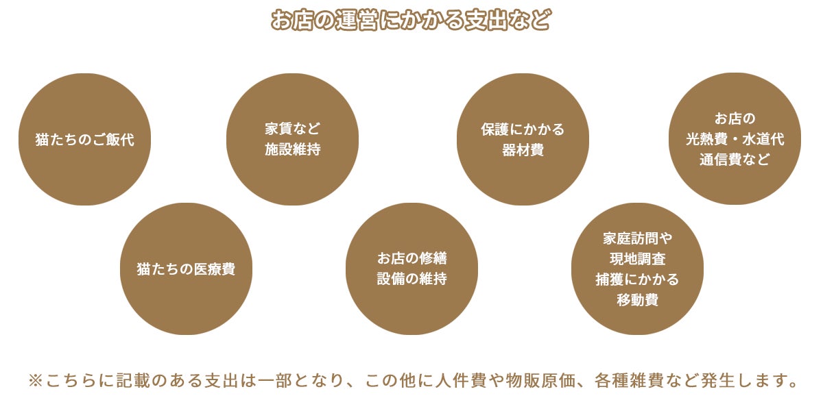 お店でお世話をしている猫たちの医療費やごはん代、施設維持費、光熱費などは、ほぼ全て皆さまからのご支援とお店の売上から賄われています。