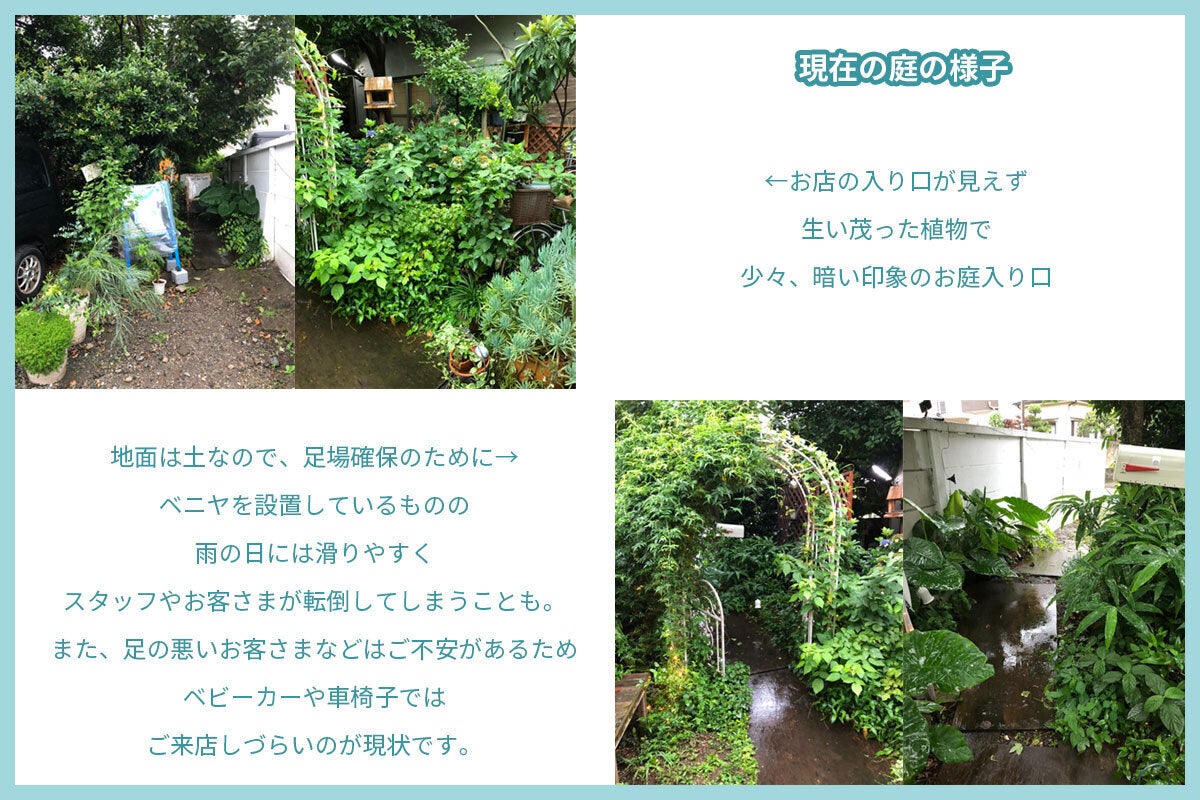自分たちで木々の剪定や草むしりをしたり、ベニヤを敷いて通路を作ったりしたのですが、道路からのアプローチは砂利で足が取られやすく、お庭も段差が多く、足の悪い方や車椅子の方、ベビーカーのお子さんなどには大変ご不便をおかけしています。また、雨の日は滑りやすく、これまで何人ものお客様やスタッフが転んでおり、非常に危険です。