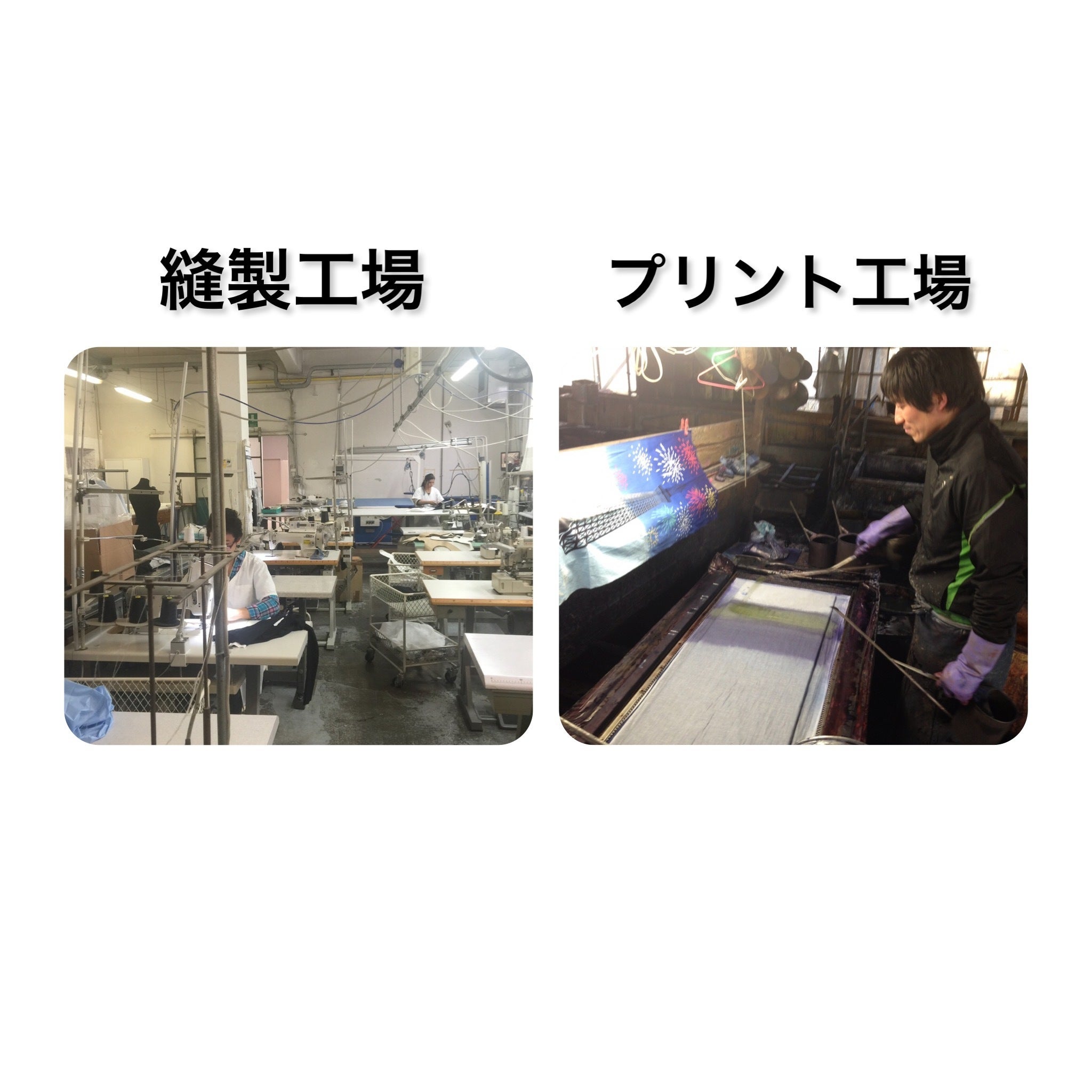 私たちは和歌山の縫製工場と京都のプリント工場で編成したジャパンメイドの