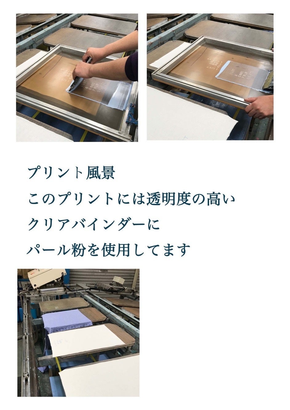 またロゴサインのプリント方法も糊にラメを練り込み光沢を効かせた手捺染にて行っています。