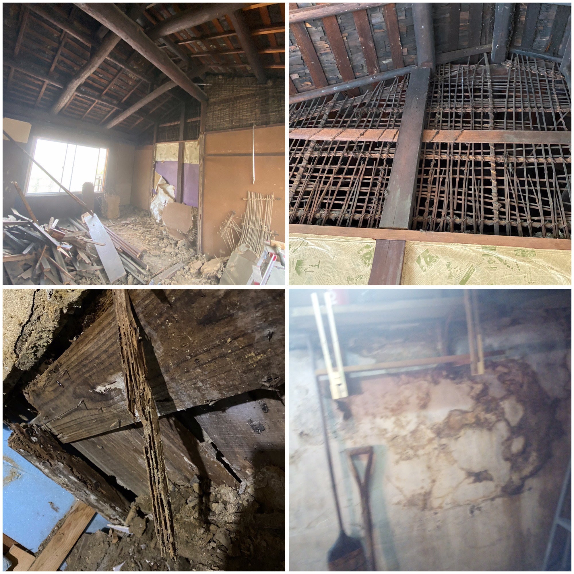 断熱材の入っていない屋根壁、シロアリにやられている躯体、雨水しみこむ防空壕