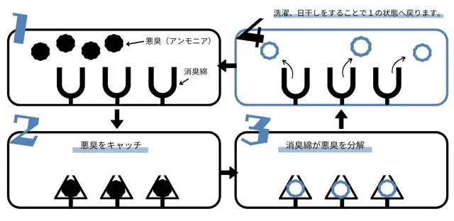 汗、加齢臭などの「悪臭の素」がアイテムに付着すると、即座にキャッチし臭いの分解が始まり、瞬時に悪臭の素を除去します。