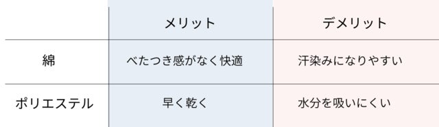 綿はべたつき感がなく快適に着ることができますが、黄ばみの原因となる成分が落ちにくい特徴があります。またポリエステルには黄ばみにくい特徴を持っていますが、水分を吸わないという特徴を持っています。