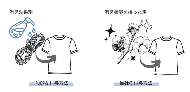 消臭効果のある製品は糸に消臭効果を付けているものが多いのですが、当社の製品は採取した「綿」自体に消臭機能を持つように加工をしております。