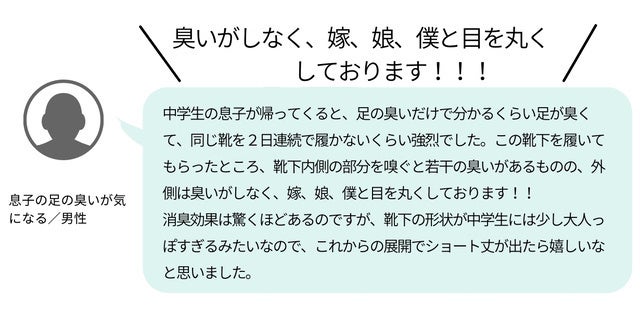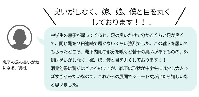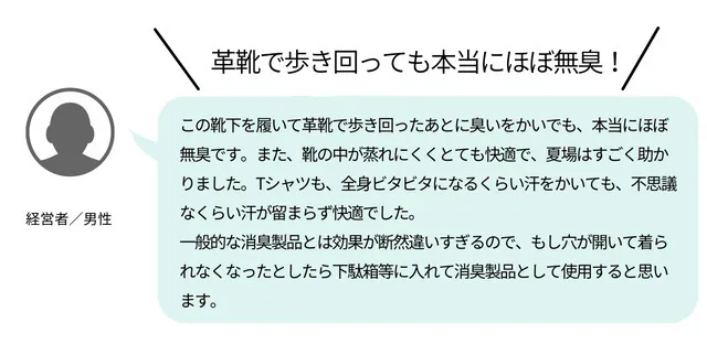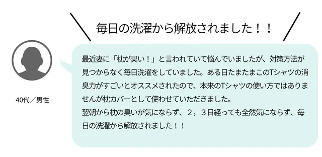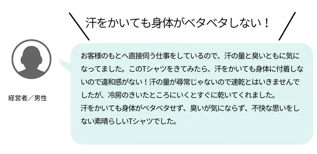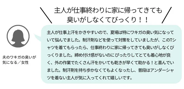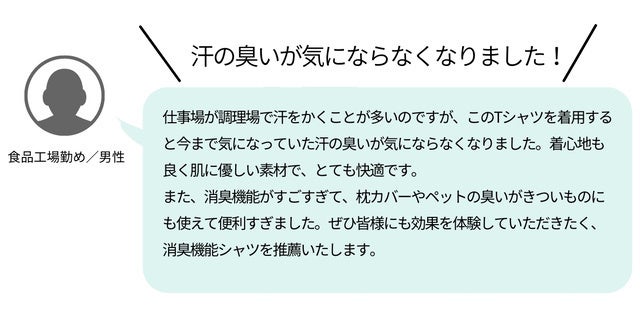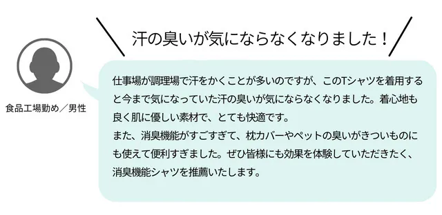 当社の『瞬間消臭シャツ』を、ワキガで実際に悩んでいる方にサンプルでご利用いただいたところ、「このシャツを着ると、黄ばみやにおいがほぼ無くなった!」と、とても感激していただきました。