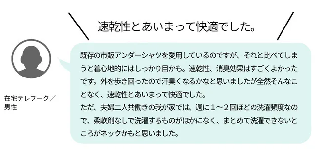 これらを考え、早く乾き快適に着ることができ、黄ばみにくい配合に辿りつくことができました。