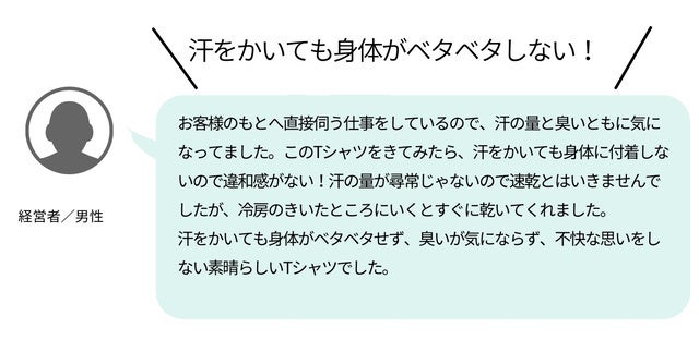 そこで、この布を使った『瞬間消臭シャツ』開発にいたりました。汗をかいたまま着続けていると肌トラブルになりやすいのですが、このシャツにはその心配がありません。
