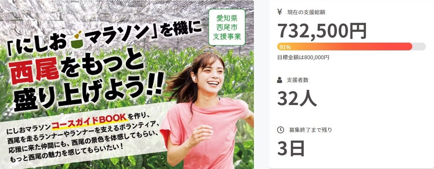 本日も多くのご支援ありがとうございました!昨日達成いたしまして、ここまで134%のところまできました!達成するまでは、達成できるかどうかわからない不安でドキドキしましたが、達成後は、より良いガイドブックを作ろう!というワクワクした気持ちになっております!今年も残すところあとわずかとなってきましたが、少しでも多くの方に西尾の魅力が届けられるよう、一層気を引き締めて頑張っていきたいと思います!引き続き応援のほど、よろしくお願いいたします!※ここまで稼働日は連日活動報告をさせていただきましたが、明日からはガイドブックの進捗にあわせて、不定期更新とさせていただきます。いつも活動報告を読んでいただいた皆様、本当にありがとうございました。