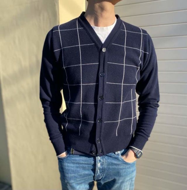 きちんと感の出るウィンドウペン柄のカーディガンをさらりと羽織るだけで、少しフォーマル感を演出できます。